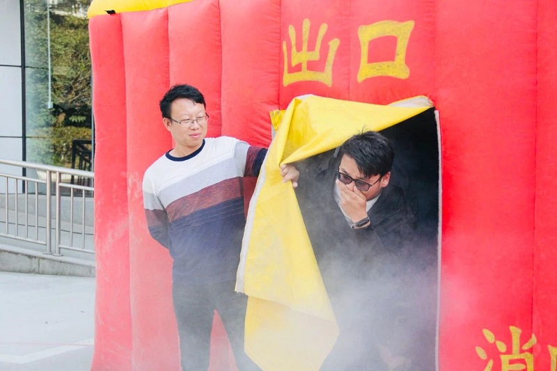 大家学习了灭火器具的使用方法:提、摇、拔、瞄、喷,分组使用灭火器进行现场灭火。随后,5人一组进行模拟火灾现场逃生。